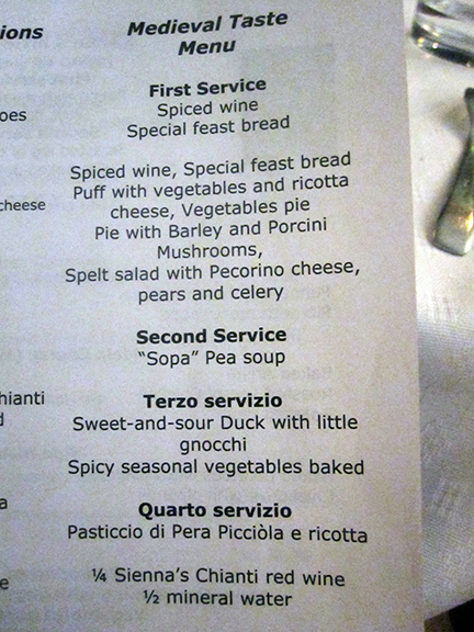 After class, we were invited to a wine tasting by the director of UNISTRA with a Japanese group that was also going so we got to taste some pretty good stuff. We tried a white, red and a chianti. I preferred the white but the others were very good as well. After we walked back to the dorms (had to drop off wine I bought) before heading out to dinner with a friend. Daisy recommended a medieval restaurant called Gallo Nero (Black Rooster) and my friend Amey and I shared the medieval tasting menu. It was different and I really enjoyed the experience.