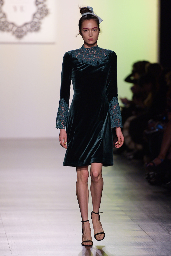 The runway presentation for Fall Winter 2017 ranged from graceful, delicate, and refined nightwear to casual daytime, and formal eveningwear. The show launched with a sea of electric pastel greens, rosy silks, and creamy nude crochet undergarments and robes, all fit for a relaxing evening at home. The show then took a turn into casual and formal bombers, dresses and pantsuits in shades of blue and rosy pink velvets. The drama was turned up at the end with formal eveningwear in tweeds and velvets saturated in deep forest and emerald greens, black, and gold.