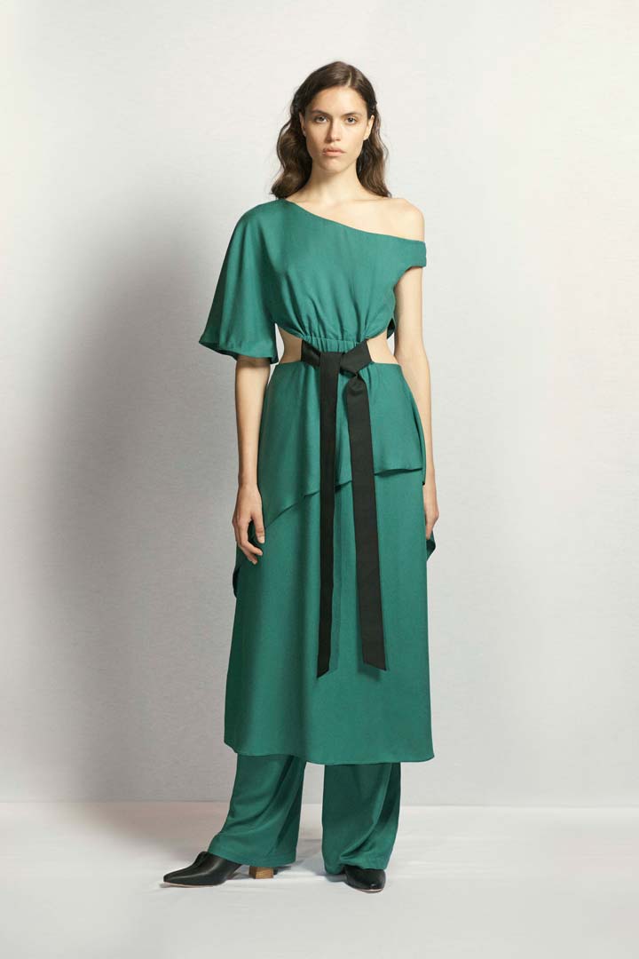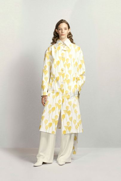 Many of the models sported simple mule slip-ons, oversized raindrop buttons and stood with Kete bag in hand, a leather flower basket shape featuring an inner drawstring silk pouch, overflowing with flowers. The silhouette shapes were focused on “the organic,” fusing loose and structured styles.