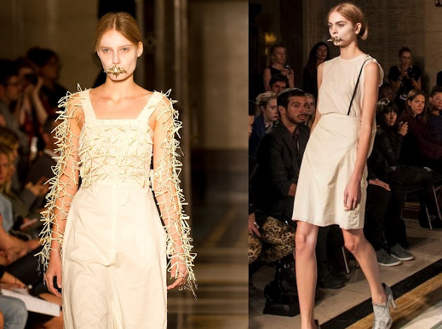 The pieces were strictly monochrome in color, the models pale with hair neatly tucked into a large, low cylindrical roll. Phoebe contrasts this minimal look with daring jewelry and detailed tailoring. Most startling were the mouthpieces – an array of bronze or silver metal spikes projecting from the models’ mouths. This unique design was reminiscent of Hannibal Lecter’s mask and gave the show a sinister tone.