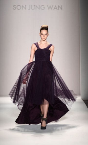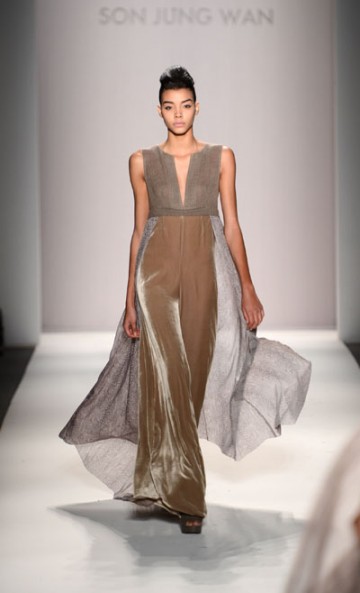 For the designer’s fifth season at Mercedes Benz Fashion Week, Son Jung Wan presented a well edited collection featuring jewel tone gowns, chic felt neutral jackets and carmel pleated wool dresses.