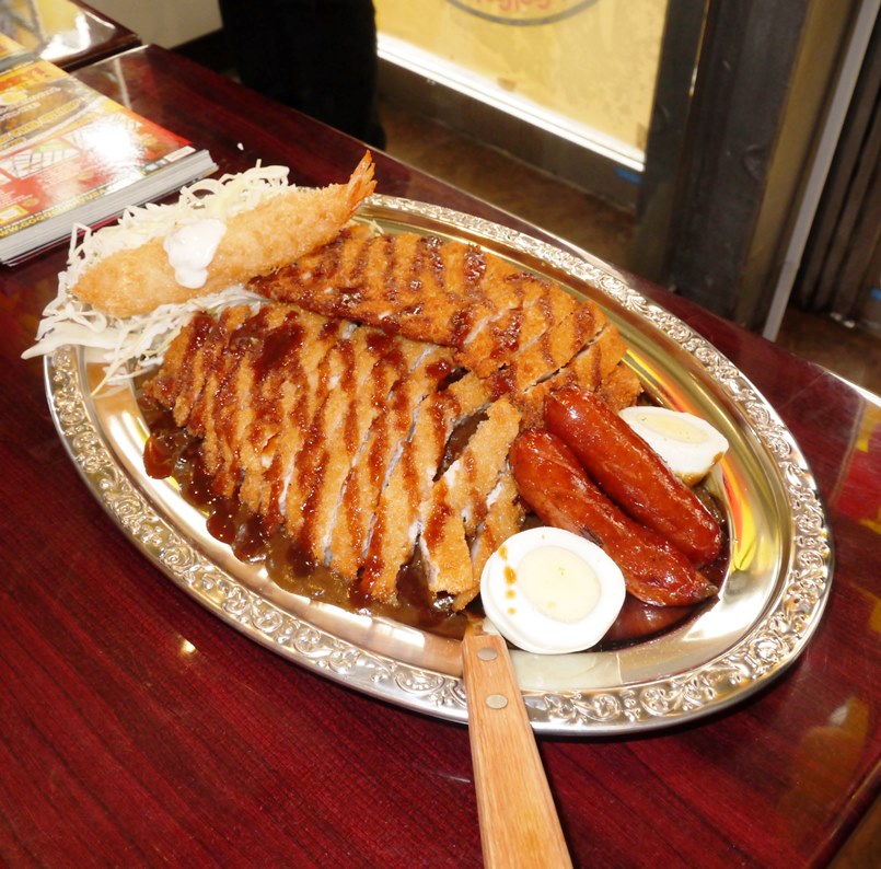David Qiu and I got to try two of the popular dishes in GoGo Curry, the Grand Slam and the Home Run Katsu. The Grand Slam is a power pack meal of both crispy pork and chicken katsu, white boiled egg, two crisp casing pork sausages, and savory shrimp tempura on top of their famous Kanazawa Curry over rice and sliced cabbage on the side. All that for a bargain of $12.50!