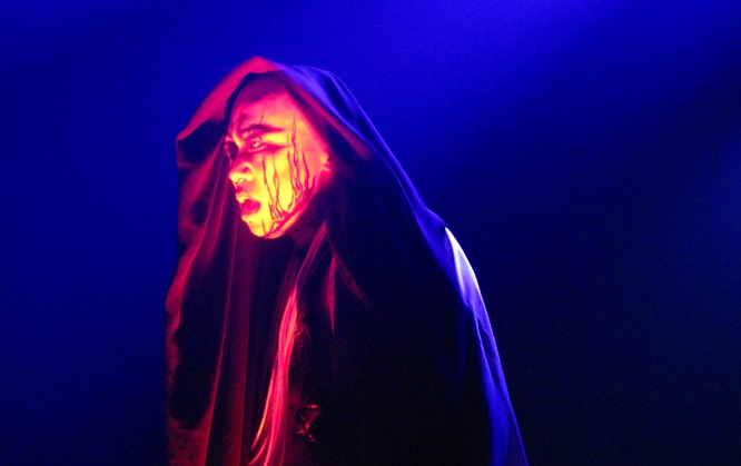 At the end, Kyo made an appearance, in black-and-white robes. His hood hid his face, and his presence was palpable, with only his face lit up in dark red and bright yellow. His face was drawn in black and white flames, and with his shaved head made him look like a dark and demonic monk.